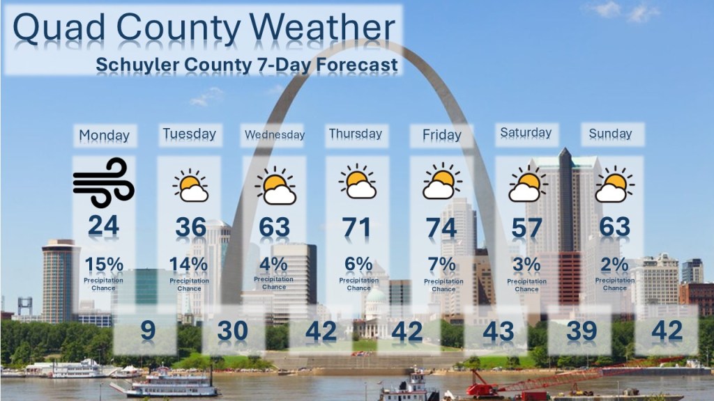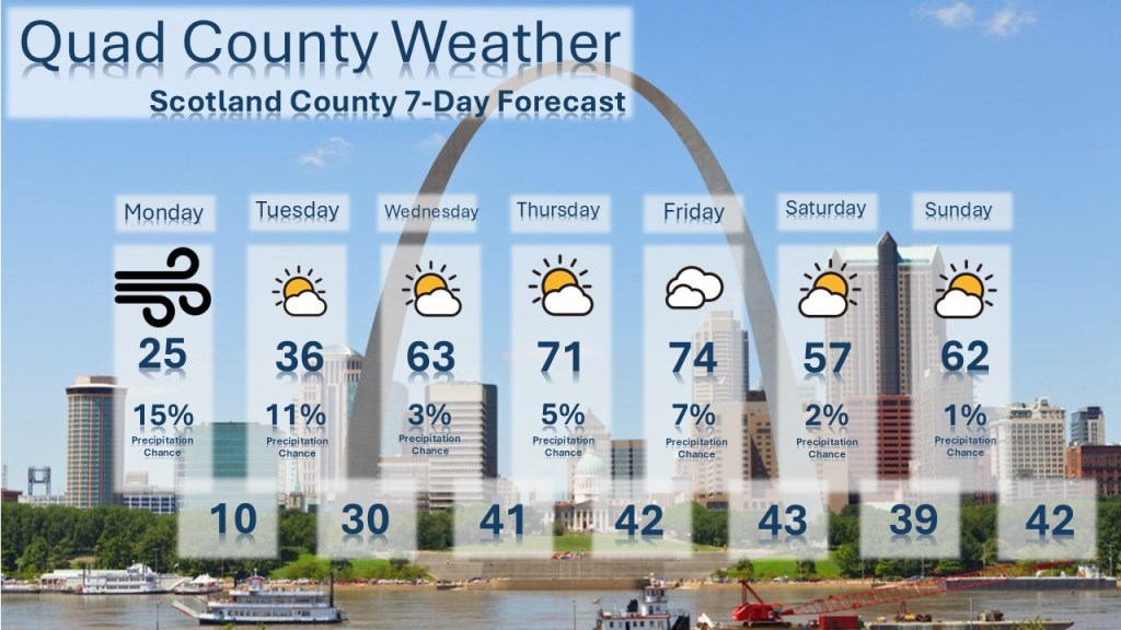 A powerful winter storm brings blizzard conditions and dangerous cold to both southeast Iowa and northeast Missouri to start the week, with blowing snow and strong winds lingering into Monday. Temperatures remain well below normal through Tuesday before a rapid warm‑up arrives midweek. By Wednesday, sunshine and southerly winds push highs into the 50s, followed by even warmer weather Thursday and an early‑spring surge into the upper 70s to near 80 degrees on Friday. The weekend turns cooler but stays mostly quiet, with highs in the 50s on Saturday and low 50s on Sunday along with a slight chance of light showers late in the day. Overall, the region transitions from harsh winter impacts to a brief taste of spring before settling back into seasonable conditions.