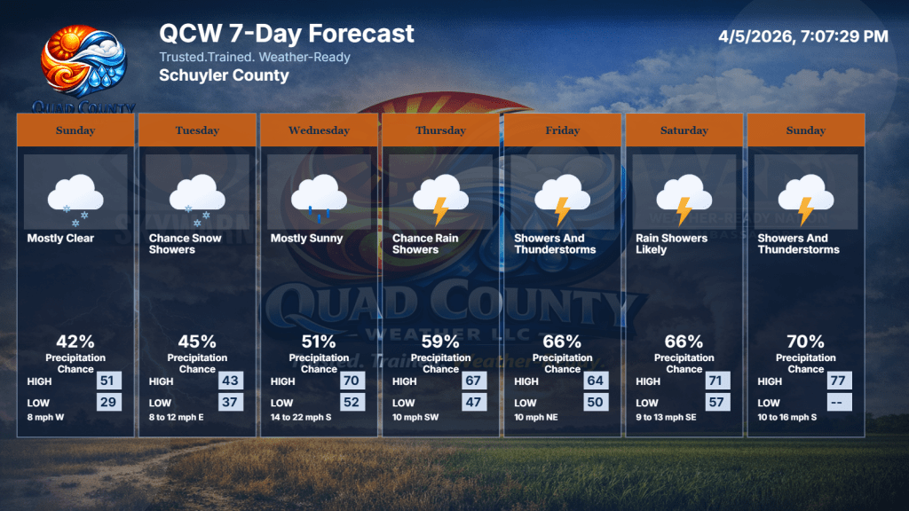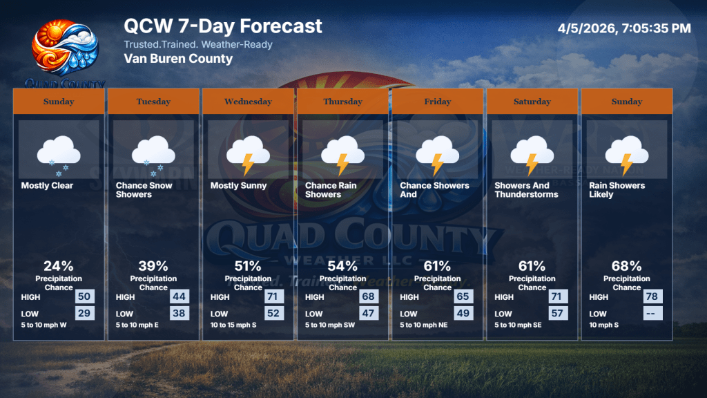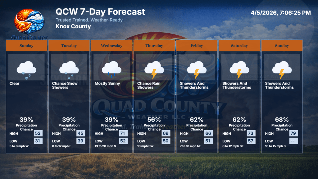 Overall, the entire QCW region transitions from winter’s leftovers to a quick burst of spring. The first part of the week is cold and breezy, but once we hit midweek, temperatures climb fast and the sunshine returns. Thursday and Friday bring the warmest stretch we’ve seen in a while — a real taste of early spring. The weekend cools off again, but stays mostly quiet, with only a low-end chance of a light shower late Sunday. It’s a week that starts rough but ends on a much brighter note.